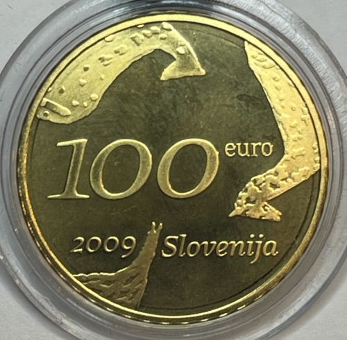 Золотая монета 100 евро "100 лет со дня рождения Зорана Музича" Словения, 2009г., Au 900, 7 г.
