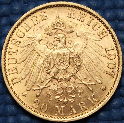 Реверс: Изображение герба Германии - коронованного орла с распростертыми крыльями. Над императорским орлом круговая надпись: "DEUTSCHES REICH 1911". Нижняя круговая надпись: "* 20 MARK *".